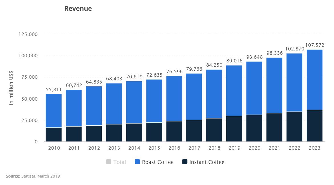 The market’s largest segment is roast coffee, with a market volume of US$59 billion in 2019, while instant coffee has a market volume of almost US$30 billion. However, the instant coffee segment is predicted to experience higher revenue growth rate at 7.5% than 4.7% for roast coffee in 2019.