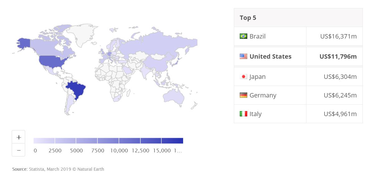The top 5 economies predicted to generate the most revenue in the coffee market are Brazil, the United States, Japan, Germany and Italy.