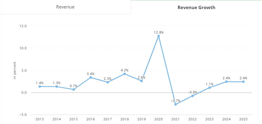 The revenue growth of pasta in the United States is dropping in correlation with the global growth trend. In the year 2020, the expected growth is 12.8% but shows a decline of 15.5% resulting in a declining -2.7% of revenue in 2025. In 2025, the revenue growth is expected to be 2.4%, in which increased by a little bit.