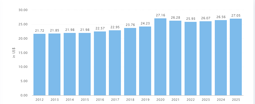 In 2020, the average price per capita spent on pasta and noodles are $27.16 USD. It is higher in 2020 than other years because every household buys pasta to store in their kitchen due to the Covid-19 pandemic. It declines for a bit but recovers again in 2025 at $27.05. Overall, the pasta market shows a steady increase over the years but may still have small unexpected drops.