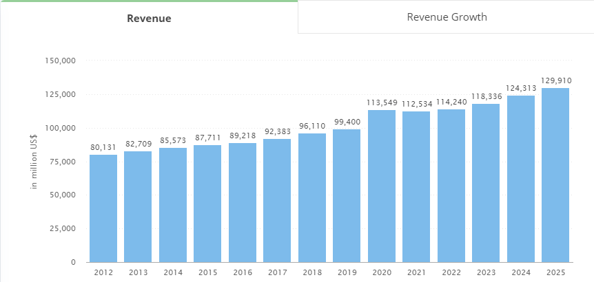 The global revenue of pasta is $113,549 million US dollars in 2020 and expected to be $129,910 million dollars in 2025. The global revenue of pasta is steadily increasing within the years however, it is growing a bit slow. The pasta market’s CAGR is expected to grow annually by 2.7% between 2020 and 2025.