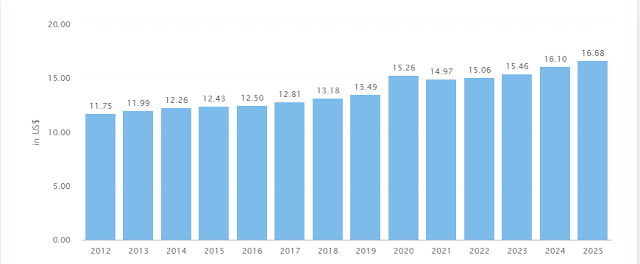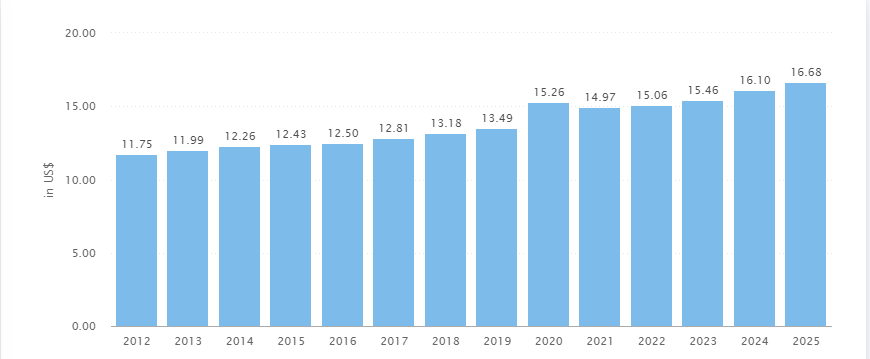 For every capita globally, the total pasta spent equals to $15.26 US dollars in 2020 and will increase to $16.68 in 2025. The total amount of money spent on pasta is not much because pasta is sold very cheaply at grocery stores. For example, a box of general pasta doesn’t cost more than $2. It can be as cheap as $.99 cents.