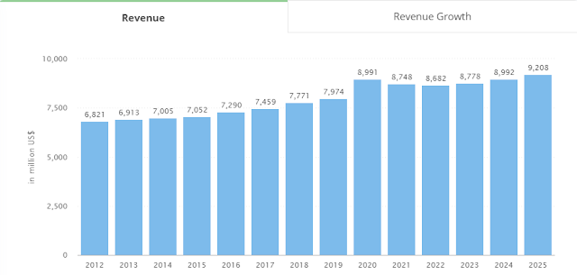 The total revenue generated in 2020 for USA is $8,991 million USD and $9,208 million USD in 2025. The pasta revenue is slowly increasing in the United States throughout the years and possibly will continue to increase at a slow rate. The annual CAGR is expected to grow by 0.5% between 2020 and 2025 in which is very slow. It may or may not continue to grow in the long run.